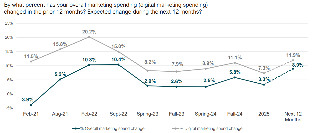 Of the many insights from the recent 34th edition of The CMO Survey, perhaps the most interesting is the expected growth rate change in overall and digital marketing spend over the next 12 months, which is forecast to increase by percentages not seen since September 2022 despite growth rates slowing over the last 12 months.